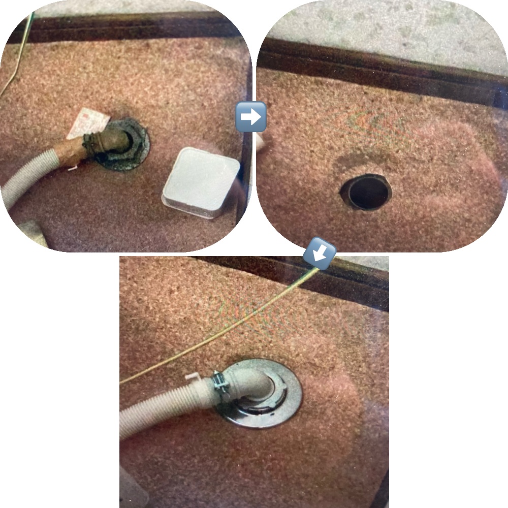 お伺いしたところ、洗濯機から排水する際に排水口から水が逆流し、床に水漏れが発生している状態でした。また、排水の流れも非常に悪く、洗濯が終わるまで時間がかかるとのことでした。